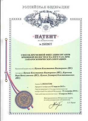 Патент. Способ временной фиксации органов брюшной полости и малого таза при лапароскопический операциях.