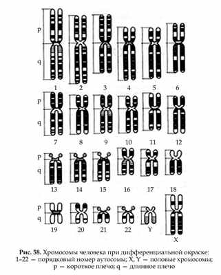 На метафазной хромосоме (рис. 59) приводятся символы, которыми принято обозначать короткое и длинное плечо, а также расположение районов и сегментов. В настоящее время существуют ДНК-маркеры или зонды, с помощью которых можно определить изменение определенного, даже очень маленького, сегмента в хромосомах (цитогенетические карты). На международном конгрессе генетики человека в Париже в 1971 г. (Парижская конференция по стандартизации и номенклатуре хромосом человека) была согласована система символов для более краткого и однозначного обозначения кариотипов.