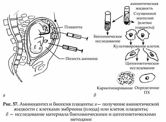 Выявление многих наследствен- ных заболеваний возможно еще до рождения ребенка. Метод пренатальной диагностики заключается в получении околоплодной жидкости, где находятся клетки плода, и в последующем биохимическом и цитологическом определении возможных наследственных аномалий. Это позволяет поставить диагноз на ранних сроках беременности и принять решение о ее продолжении или прерывании.