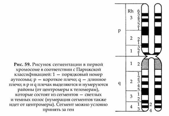 Сегменты и районы метафазной хромосомы обозначаются цифрами, центромера служит исходной точкой для цифровой схемы. При определении локализации гена используют 4 критерия: номер хромосомы, символ плеча, номер района и номер сегмента в пределах этого района. Например, запись 1р32 означает, что речь идет о хромосоме первой пары, коротком плече, районе 3, сегменте 2. Для гена Rh (рис. 59) формула локализации: 1р35.