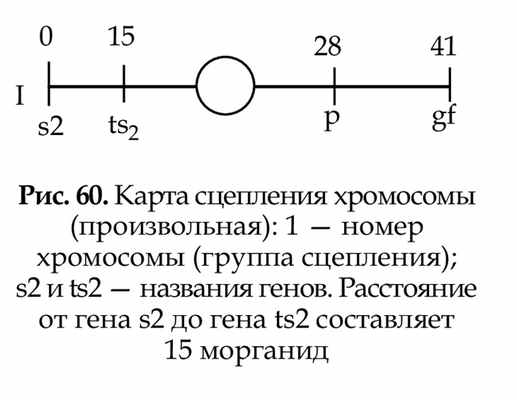 Карта сцепления — схема расположения генов, находящихся в одной группе сцепления, т. е в одной хромосоме (рис. 60). За единицу расстояния между генами принята морганида, которая отражает частоту кроссинговера.Одна морганида — расстояние между генами, при котором кроссинговер происходит в 1% гамет (1 морганида = 1% кроесинговера. При составлении картсцепления указываются: номер хромосомы; полное или сокращенное название генов;