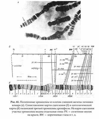 Цитологическая карта составляется на основании из- учения политенных хромосом (рис. 61 а, б), что позволяет сопоставить структуру синтезируемого белка с определенным участком хромосомы (геном), так как транскрибируемый участок определяется под ми- кроскопом в виде пуфа. Это позволяет определить локализацию гена. Изучение политенных хромосом имеет экспери- ментальный характер, так как у человека их нет.