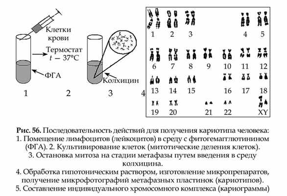 На рис. 56 представлена последовательность действий для получения кариотипа человека.