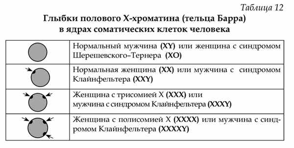 Зная число глыбок полового хроматина, можно определить число Х-хромосом по формуле п + 1, где п — число глыбок, а 1 — активная Х-хромосома; и наоборот, зная число Х-хромосом, можно определить число телец Барра по формуле п -1, где п — число Х-хромосом, а 1 — активная Х-хромосома (табл. 12).