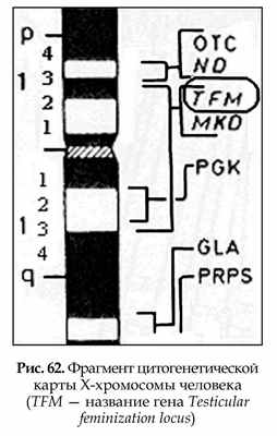 Цитогенетические карты хромосом (рис. 62) составляются на основе дифференциальной окраски (темные и светлые полосы) и картирования генов в отдельных локусах хромосом (основа Парижской классификации). Современные методы окрашивания позволяют выявить до 1000 полос. В среднем на хромосому человека приходится 50 полос. Каждая полоса содержит 3 х 106 пар нуклеотидов, что соответствует нескольким сотням генов (районы и сегменты). Картирование генов в хромосомах является результатом современных молекулярно-генетических методов исследования.