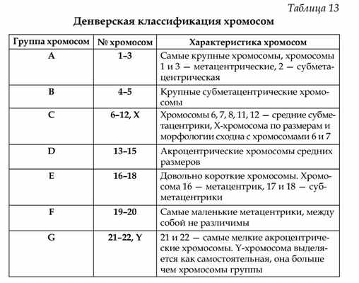 Классификация и номенклатура равномерно окрашенных хромосом (стандартное окрашивание) была разработана на международных совещаниях в Денвере (1960), Лондоне (1963) и Чикаго (1966). Согласно рекомендациям этих конференций, хромосомы располагаются в порядке уменьшения их длины от 1 до 23 хромосомы. Они разделены на 7 групп, которые обозначены буквами английского алфавита от А до G. Все пары хромосом предложено нумеровать арабскими цифрами: группа А 1-3, В 4-5, С 6-12 и Х-хромосома, D 13-15, Е 16-18, F 19- 20, G 21-22, Y-хромосома (табл. 13). При этом хромосомы различных групп хорошо отличаются друг от друга (критерии: размер и форма — метацентрические, субметацентрические, акроцентрические), в то время как внутри группы их сложно различить, за исключением хромосом группы А (рис. 64,65).