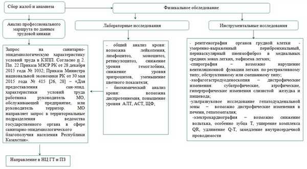 | Физикальное обследование | ЦНС: общий гипергидроз, стойкий красный дермографизм, оживление сухожильных рефлексов, тремор век, пальцев рук, лабильность АД. Органы дыхания: катаральные, гипертрофические изменения слизистой носа, глотки; в лѐгких непостоянные сухие хрипы. Органы пищеварения: возможна болезненность в эпигастральной области. | ЦНС: общий гипергидроз, стойкий красный дермографизм, лабильность АД, оживление сухожильных рефлексов, тремор век, пальцев рук. Органы дыхания: субатрофические изменения слизистой носа, глотки, цианоз губ, слизистых; увеличение частоты дыхания, легочный звук с коробочным оттенком, сухие, реже влажные хрипы на фоне жесткого или ослабленного дыхания. Органы пищеварения: болезненность в эпигастральной области, в правом подреберье; небольшое увеличение размеров печени. Костная система: скованность в крупных суставах Со стороны сердечно-сосудистой системы: тахикардия, приглушенность сердечных тонов. | ЦНС: парестезии, гиперестезии или гипестезии, спастическое или спастико-атоническое состояние капилляров ногтевого ложа, снижение мышечного тонуса и силы мышц. Органы дыхания: атрофические процессы в носу, глотке, гортани, возможно изъязвление слизистой оболочки носа и даже прободение носовой перегородки, увеличение частоты дыхания, ограничение подвижности грудной клетки, при перкуссии коробочный звук, аускультативно: ослабление везикулярного дыхания, жесткое или мозаичное дыхание, сухие, реже влажные хрипы, шум трения плевры. Органы пищеварения: болезненность в эпигастральной области, в правом подреберье, увеличение размеров печени. Костная система: скованность, тугоподвижность в позвоночнике, крупных суставах. Сердечно-сосудистая система: тахикардия, экстрасистолы, приглушенность сердечных тонов, | ||