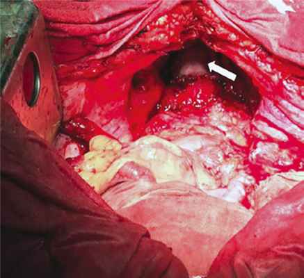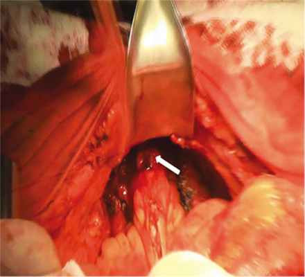 Рис. 3. Передняя стенка влагалища (указана стрелкой), сформированная из сегмента тонкой кишки (интраоперационная фотография).