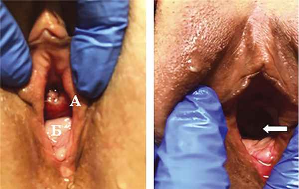 Рис. 8. Послеоперационные фотографии: видно преддверие влагалища, в полость влагалища установлен акушерский пессарий (указан стрелкой) для удержания мочи.