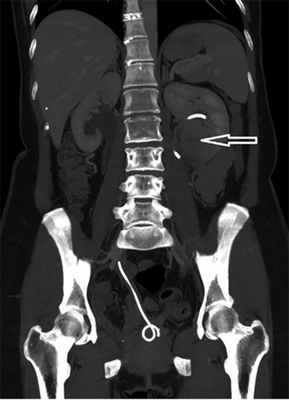 Рис. 1. МСКТ-картина органов брюшной полости (завиток стента выполняет всю полость мочевого пузыря). Абсцесс нижнего полюса левой почки указан стрелкой.