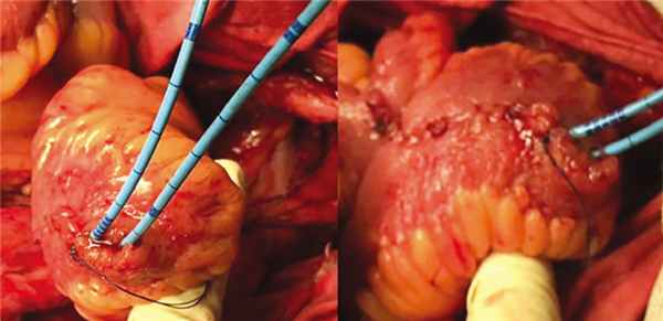На следующем этапе сформирован антирефлюксный мочеточниково-пузырный анастомоз. Для этого на противобрыжеечном крае кишки отсепаровали и удалили ее серозно-мышечный слой на участке размером 5×20 мм. Мочеточник уложили до середины выкроенной площадки. На заднюю полуокружность мочеточника и верхний край рассеченной серозно-мышечной оболочки наложили узловые швы. После сшивания задней губы анастомоза в мочеточники установили интубатор (мочеточниковый катетер) и сшили переднюю губу анастомоза. Далее наложили прошивные лигатуры на верхний и нижний края серозно-мышечной площадки. При подтягивании за нити и погружении оболочек диссектором произвели инвагинацию мочеточника в просвет тонкой кишки (рис. 4, на цв.вклейке). По углам анастомоза остаются неушитыми участки тонкой кишки длиной 1 см. На серозно-мышечные оболочки кишки как правого, так и левого угла необходимо наложить 2—3 узловых шва. После этого мочеточниковые интубаторы следует вывести через дистальный отдел мочевого пузыря (рис. 5, на цв. вклейке).