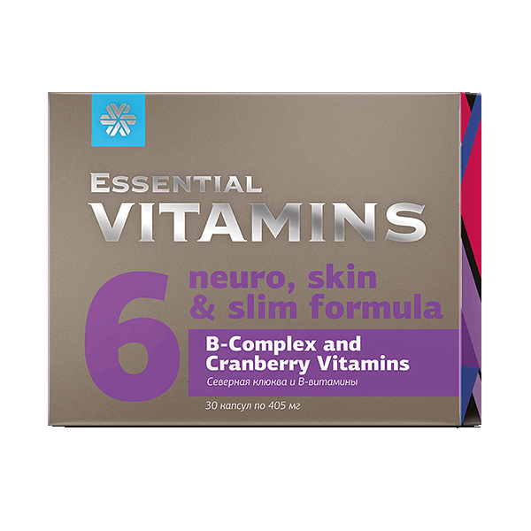 Северная клюква и В-витамины - Essential Vitamins. Сбалансированный комплекс с высокими дозировками важнейших витаминов группы B, усиленных природными антиоксидантами дикой клюквы, улучшает обмен веществ, поддерживает нервную систему и улучшает состояние кожи, ногтей и волос.
