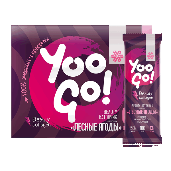 Beauty-батончик Лесные ягоды из линейки оперативного питания YooGo. Каждый батончик - это два вида протеина, обеспечивающие организм оптимальным количеством белка, сушёные ягоды клюквы и облепихи, обогащающие рацион медленными углеводами, а также природный коллаген и натуральный малиновый сок.