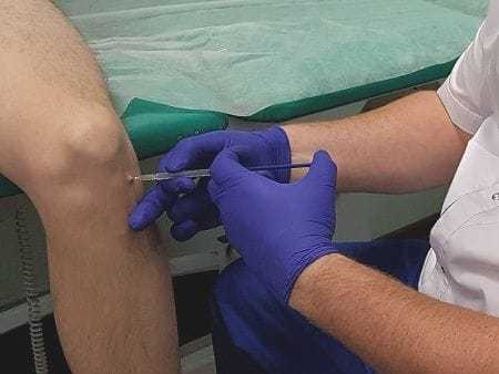 - Пункция сустава. Выполняется при первичном обращении, в последующем – по мере накопления жидкости. Уменьшает болевой синдром, создает более благоприятные условия для восстановления поврежденных структур, устраняет потенциальную питательную среду для развития инфекции.