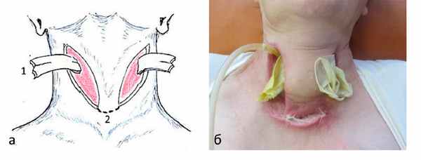 При распространении процесса на средостение боковые разрезы соединяли овальным разрезом над яремной вырезкой и, отделяя кожно-фасциальный лоскут от подлежащих органов и тканей, получали широкий доступ к верхнему средостению. Раскрывали его и дренировали перфорированными трубчатыми дренажами через имеющиеся боковые разрезы на шее с последующим подключением к активной аспирации (рисунок 3б). При наличии показаний операцию дополняли шейной трахеостомией. Вопрос о наложении трахеостомы всегда решали индивидуально. Основными показаниями для трахеостомии в наших наблюдениях были: признаки сдавления и обструкции верхних дыхательных путей, необходимость продленной ИВЛ в послеоперационном периоде, признаки тотального гнойного поражения средостения. Ее выполнили у 24 (45,3%) пациентов проспективной группы, что в 1,5 раза больше, чем в группе сравнения. С 64,2 до 96,2% выросла доля эндотрахеальных наркозов, а у 17 пациентов основной группы (32,1%) внедрили методику интубации трахеи на спонтанном дыхании с помощью видеобронхоскопа (p=0,01). В результате удалось снизить длительность послеоперационного лечения в проспективной группе глубоких флегмон шеи с 28,3 до 20,2 койко-дня, а летальность - с 9,7 до 3,8% (p