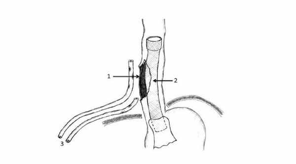 Рисунок 4 — Схема комбинированной операции: эндоскопическая установка стента (2) к дефекту пищевода (1) и видеоторакоскопическая медиастинотомия с постановкой дренажей в средостение (3)