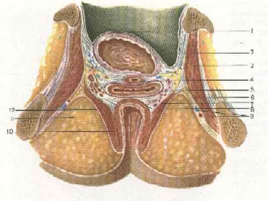 Околопростатическая клетчатка ограничена сверху — отрогом верхней фасции диафрагмы таза, переходящим на предстательную железу; снизу — верхней фасцией мочеполовой диафрагмы; с боков - лобово-простатическими связками, переходящими кзади в пузырно-крестцовые связки; сзади — фасциальными футлярами семенных пузырьков и семявыносящих протоков. Около-простатическое клетчаточное пространство сообщается по ходу сосудов с областью промежности, по фасциальному футляру семявыносящего протока — с клетчаткой внутреннего отверстия пахового канала, и по фасциальному футляру мочеточника - с парауретральной клетчаткой.