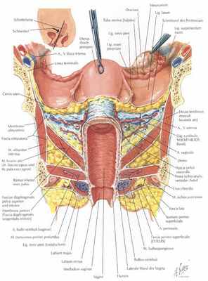Околовлагалищная клетчатка. Имеет передний и задний отделы, разделенные срединными прямокишечными сосудами. Располагается вокруг всей влагалищной трубки, спереди сообщается с околопузырной клетчаткой, сзади - с прямокишечной, с боков - с боковыми клетчаточными пространствами, сверху - с околоматочной клетчаткой.