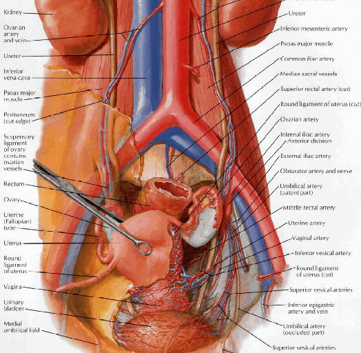 На уровне седалищной ости мочеточник поворачивает медиально и кпереди, проходит под основание широкой связки матки, где вторично пересекает маточную артерию, располагаясь сзади от нее, на расстоянии 1-3 см (наиболее важный перекрест мочеточника с маточной артерией - зона «хирургического риска»). Такая близость мочеточника и маточной артерии является важным анатомическим фактом, который необходимо учитывать пр выполнении операции в этой области, чтобы избежать травм мочеточника, особенно при выполнении эндоскопической надвлагалищной ампутации матки или экстерпации матки и др.