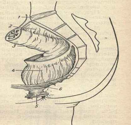 Рис. 20. Позадипрямокишечное предсакральное пространство. Прямая кишка и её капсула. 1 — promontorium; 2 — mesocolon pelvinum; 3 — colon pelvinum; 4 — pars pelvina; 5 — pars perinealis recti; 6 — diaphragma pelvis. (Николаев А.В.).