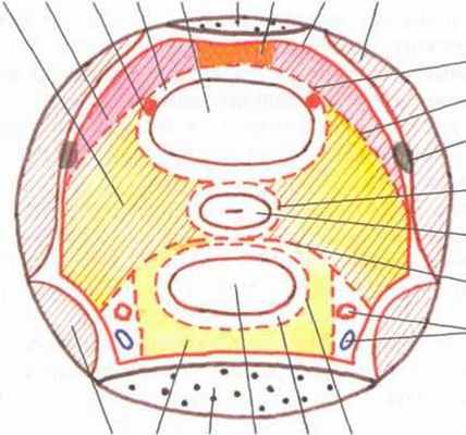 Рис. 17. Клетчаточные пространства женского таза на горизонтальном срезе (схема). (Николаев А.В.).
