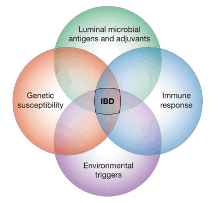 Язвенный колит и болезнь Крона являются хроническими, рецидивирующими, иммунологически опосредованными заболеваниями, которые в совокупности называют воспалительными заболеваниями кишечника (IBD). Распространенность IBD быстро растет в Европе и Северной Америке, и эти заболевания становятся все более распространенными в остальном мире, поскольку разные страны принимают западный образ жизни. Такие эпидемиологические наблюдения показывают, что существуют сильные экологические воздействия на IBD: их влияние подтверждается относительно низким уровнем совпадения признаков у идентичных близнецов (~50 % для болезни Крона и ~10 % для язвенного колита). Эти исследования подтверждают генетическую роль в развитии данных патологий. Даже при этом наборе знаний, этиологии этих болезней остаются загадкой. Есть несколько дополнительных теорий развития болезни Крона и язвенного колита. Наиболее широко распространена гипотеза о патогенезе IBD, которая заключается в том, что чрезмерно агрессивные (опосредованные Т-клетками) иммунные ответы на подмножество условно-патогенных энтеробактерий влияют на развитие генетической восприимчивости организма-хозяина.