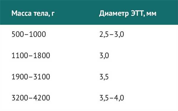 Для новорожденных детей существуют отдельные требования. Диаметр ЭТТ в зависимости от массы тела при рождении представлен в таблице 2.
