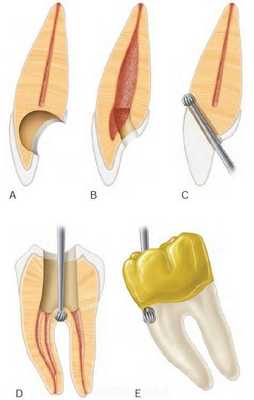 Восстановление утраченной части коронки в депульпированных зубах осуществляется при помощи протезирования. При устранении дефектов депульпированных зубов особенно широко применяют пластмассовые вкладки, укрепленные штифтами. Следует кратко остановиться на препарировании этих зубов для прохождения и обработки корневых каналов, что является одним из главных факторов успешного лечения депульпированных зубов.