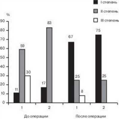 В то же время при обследовании больных через 1 год после операции, несмотря на реперфорацию, отмечено уменьшение размера дефекта барабанной перепонки, улучшение вентиляционной и дренажной функции (до операции вентиляционная функция II степени у 59%, дренажная II степени - у 83%, после операции - I степени у 67% и у 75% соответственно), что обеспечивает лучшие условия для успешной реоперации (см. рисунок). Рисунок 1. Состояние вентиляционной (1) и дренажной (2) функций слуховой трубы у пациентов до и через 1 год после операции.