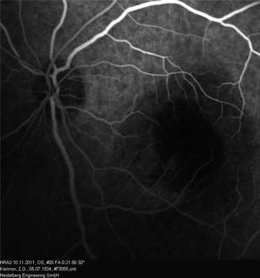 Флюоресцентная ангиография: OD в венозную фазу — несколько мелких гиперфлюоресцирующих округлых фокусов (друзы).