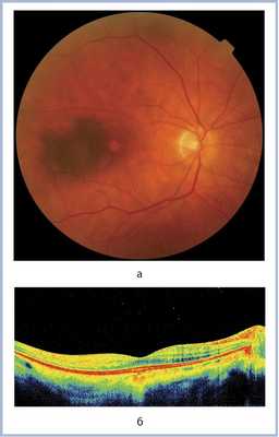 Рис. 4. Фотография (а) и ОКТ (б) глазного дна больной Ч., 54 года. Диагноз: невус хориоидеи. Объяснение в тексте.