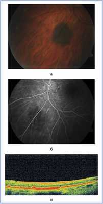 Рис. 5. Фотография (а), ФАГ (б), АФ (в) глазного дна больного П., 82 года. Диагноз: прогрессирующий невус. ПОУГ. Миопия высокой степени. Объяснение в тексте.