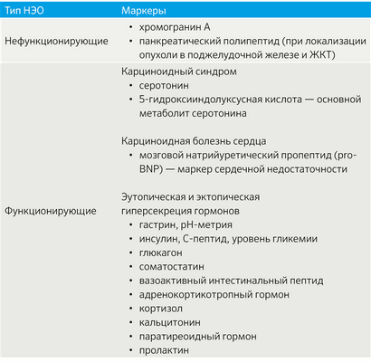 Ввиду многообразия секретирующего профиля НЭО биохимическая диагностика включает различные маркеры, комбинируемые с учетом клинической картины (табл. 4).