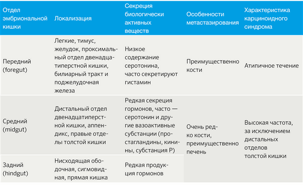 НЭО классифицируют в зависимости от отдела эмбриональной кишечной трубки: из передней, средней и задней кишки (табл. 1) [2].