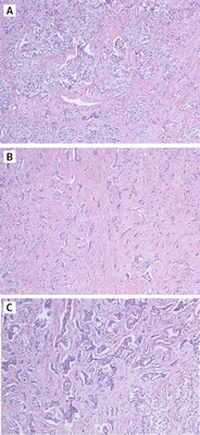 Отмечается наличие хорошо организованной гистоархитектуры: А — органоидный тип; В — псевдотрабекулярный тип; С — крибриформный тип. Окраска гематоксилин-эозин [10].