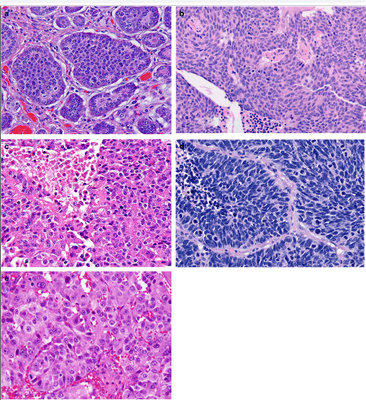 а — НЭО G1 (Grade) подвздошной кишки, б — НЭО G2 легкого (атипичный карциноид), с — НЭО G3 поджелудочной железы, d — мелкоклеточный НЭР легких, е — крупноклеточный НЭР поджелудочной железы. Окраска гематоксилин-эозин [9].