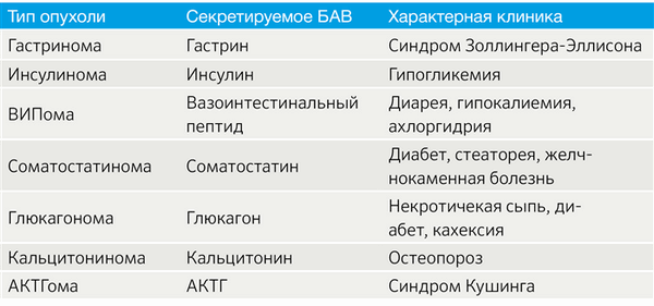 Важным аспектом является функциональный статус опухоли. В зависимости от наличия продукции БАВ выделяют функционирующие (табл. 2) и нефункционирующие новообразования [3].