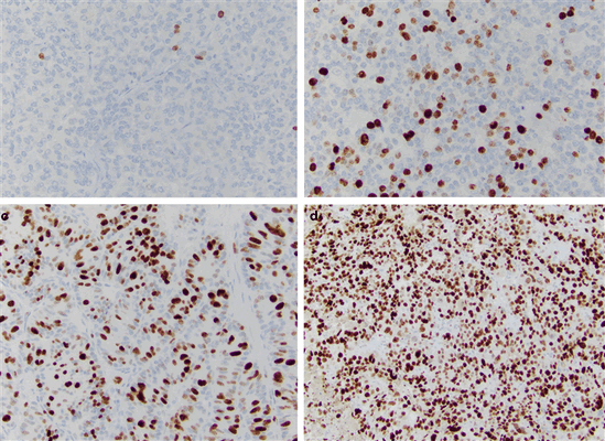а — НЭО G1 (Grade) подвздошной кишки, б — НЭО G2 легкого (атипичный карциноид), с — НЭО G3 поджелудочной железы, d — мелкоклеточный НЭР легких [9].