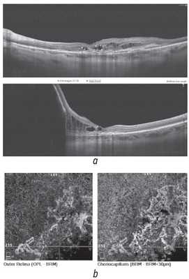 По данным структурной ОКТ определялись: куполообразная отслойка пигментного эпителия сетчатки, блокирующая прохождение ОКТ-сигнала, аккумуляции интраретинальной жидкости и интраретинальных гиперрефлективных включений, плоская фиброваскулярная отслойка пигментного эпителия сетчатки с признаком «двойного слоя» (рис. 3, а). ОКТ-ангиография в пласте наружной сетчатки и хориокапилляриса визуализировала ветвящуюся сосудистую сеть в проекции макулярной зоны (рис. 3, b) [7].