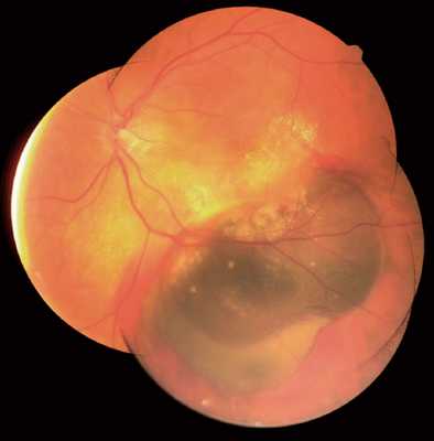 Склерохориоидальная кальцификация: на глазном дне правого глаза вдоль верхневисочной аркады определяются три желто-белых образования. Правый глаз другого пациента. Крупный солитарный очаг склерохориоидальной кальцификации вдоль верхневисочной аркады. Регматогенная отслойка сетчатки. Так как разрывы сетчатки выявляются с трудом, пациента направили к специалисту с подозрением на меланому хориоидеи. Складки на поверхности и разрыв сетчатки помогают дифференцировать это состояние и меланому. Высоко выступающая в стекловидную полость склеральная пломба после оперативного лечения отслойки сетчатки была ошибочно принята за меланому. Буллезный ретиношизис, симулирующий меланому хориоидеи. В отличие от меланомы сквозь образование виден плоский сосудистый рисунок хориоидеи. Иногда меланому симулируют отложения пигмента вокруг разрывов наружного слоя. Цилиохориоидальная отслойка, появившаяся вскоре после оперативного лечения катаракты, симулирующая цилиохориоидальную меланому. Ora serrata, видимая через расширенный зрачок, также свидетельствует в пользу данного диагноза. В отличие от меланомы, при диафаноскопии цилиохориоидальная отслойка хорошо пропускает свет. Интракапсулярная экстракция и секторальная иридэктомия по поводу катаракты выполнены много лет назад.