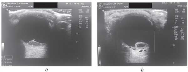 По данным ультразвукового исследования с доплеровским картированием в нижнем отделе глазного яблока было выявлено округлое образование неоднородной эхоплотности, размерами 0,32 × 0,80 см, с отсутствием сосудистого сигнала в центре образования (рис. 2).