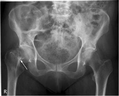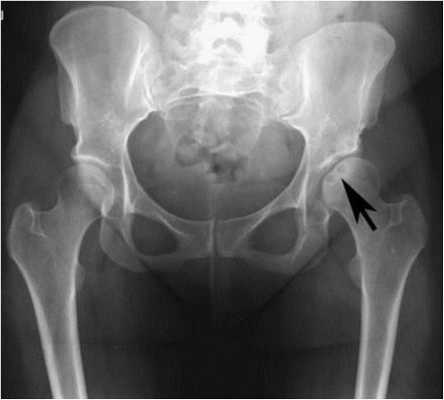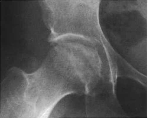 - головка бедренной кости сильно деформирована, цвет верхней части головки на рентгене выглядит светлее (признак микроперелома костных балок из-за повышенного давления на верхнюю часть головки).