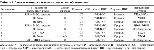 Таблица 2. Данные анамнеза и основные результаты обследования* Примечание. * — подробное описание клинических случаев см. в тексте. P — пегинтерферон-α; R — рибавирин; BОС — боцепревир; TVR — телапревир; SMV — симепревир; МВО — медленный вирусологический ответ; НО — нулевой ответ; н/д — нет данных.