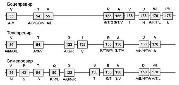 Рис. 2. Варианты мутаций в гене NS¾A-протеазы вируса, ассоциированные с резистентностью к ИП.