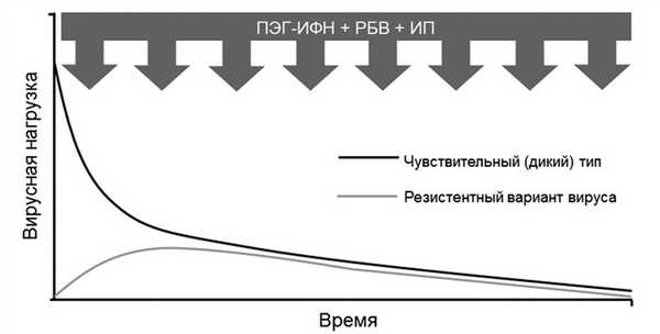 При высокой чувствительности пациента к ИФН наличие мутаций устойчивости к ИП незначимо, так как подавление всех штаммов вируса (диких и резистентных) обеспечивается ПЭГ-ИФН/РБВ.