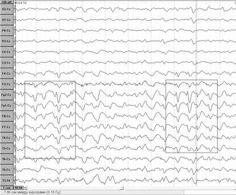 Изменения на ЭЭГ наблюдаются в развернутой стадии заболевания в виде двух- или трехфазных острых волн с частотой 1-2 в секунду, которые обычно накладываются на общий сниженный фон активности (см. рисунок). Рисунок 1. ЭЭГ больного БКЯ, развернутая стадия. В последние годы у этих больных в цереброспинальной жидкости (ЦСЖ) обнаружен атипичный белок 14.3.3, которому придается диагностическое значение [2, 4]. При МРТ-исследовании головного мозга этих больных может определяться усиление ответа от подкорковых ядер [1].