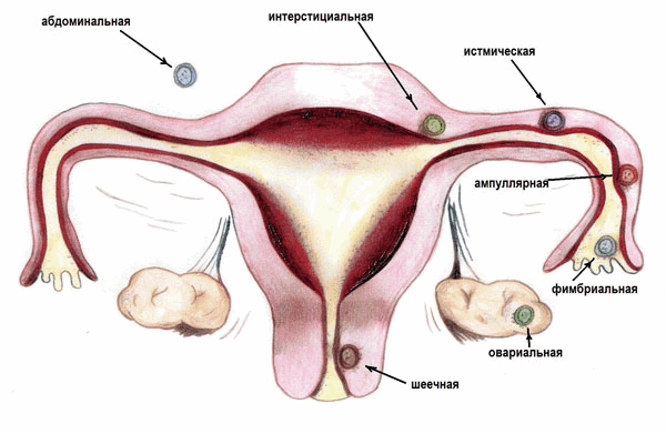Один из самых грозных гинекологических диагнозов, до недавнего времени звучавший, как приговор — эктопическая беременность. Причинами возникновения аномальной локализации беременности могут послужить заболевания, вызывающие нарушение транспорта и патологию имплантации плодного яйца. Чаще всего, в 97.7 % случаев внематочная беременность развивается в маточных трубах. Также плодное яйцо может развиваться в брюшной полости, в углу матки (интерстициальная эктопическая беременность), в шейке матки, в яичниках. Если беременность развивается в маточной трубе, то около 80 % случаев составляет локализация в ампуллярном отделе (расширенная часть маточной трубы), 12 % — в перешейке маточной трубы — истмическая форма, 5 % — в области фимбрий (бахрома на краях маточных труб), 2 % в углу матки и 2 % в толще матки в области угла (интерстициальная форма).