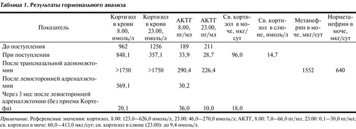 При обследовании отмечено повышение уровня кортизола в сыворотке и нарушение ритма его секреции: утром — 848 нмоль/л, вечером — 357 нмоль/л. Нарушения ритма секреции АКТГ выявлено не было: уровень АКТГ утром — 33,91 пг/мл, вечером — 28 пг/мл. Экскреция свободного кортизола с мочой оказалась нормальной (96 нмоль/сут). Содержание кортизола в слюне вечером повышено до 14,7 нмоль/л (табл. 1).