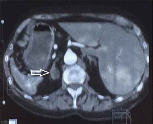 Рис. 1. МСКТ органов брюшной полости и забрюшинного пространства. Стрелкой указано объемное образование левого надпочечника.