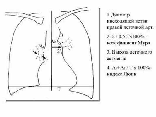 В практической работе наиболее доступно количественное определение c тепени расширения нисходящей ветви правой легочной артерии, входящей в состав правого корня (1). Последняя не является непосредственным продолжением легочного ствола, как левая, не закрыта тенью сердца, рентгенологически лучше визуализируется и более доступна для измерения. Диаметр этой ветви отсчитывается от наружной границы главного бронха до наружного контура тени корня и в норме не превышает 15 мм .